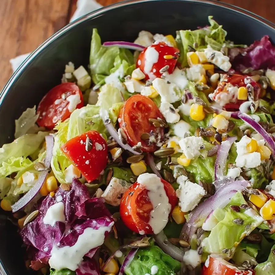 Mix sałat, kurczak z papryką i zestaw warzyw z aromatycznym, jogurtowo-chrzanowym sosem.